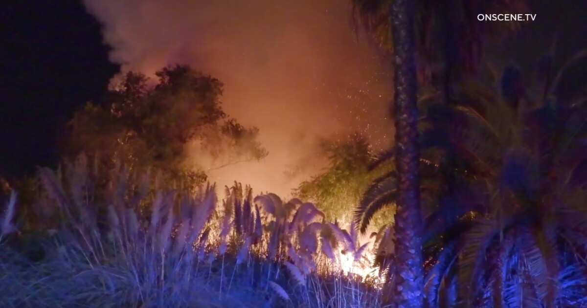 It was unclear how the blaze started, but Beveridge said the area has a known homeless population. He said firefighters working to mop up the blaze were dealing with “very thick, heavy brush,” as well as “some big trees and quite a bit of debris.”