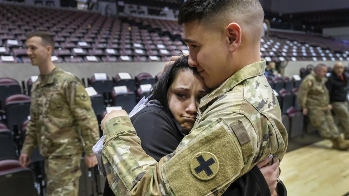 Staff Sgt. Jacob Webb (right), of Harrisburg, gets a hug from his sister, Mia Travelstead, following the Mobilization Ceremony for the Illinois National Guard 2nd Battalion, 130th Infantry Regiment at the Banterra Center on Tuesday afternoon in Carbondale. The approximately 400 soldiers of the unit based in Marion are being deployed in support of Operation Freedom’s Sentinel.